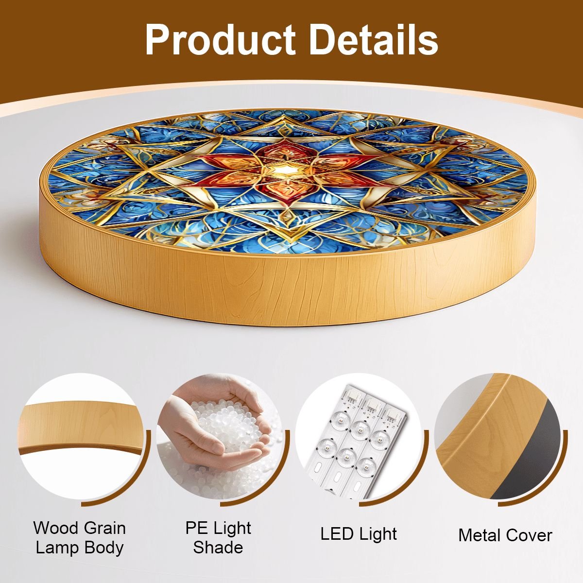 - Material Description: Made with iron frame and a PE diffusing panel, this ceiling light offers a sleek wood grain finish.